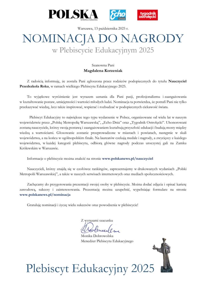 WięcejDrodzy Rodzice, Dziękujemy za nominacje do nagród oraz głosy oddane w PLEBISCYCIE EDUKACYJNYM 2025. Wszystkie informacje o akcji znajdują się na stronie: www.polskanews.pl/nauczyciel Głosować można do dnia 3 grudnia 2025 r. do godz. 21.00 na stronie: www.polskanews.pl/nauczyciel lub wysyłając SMS na numer 7303 o treści: MZP.74 – w kategorii Nauczyciel Przedszkola MZR.114 – w kategorii […]