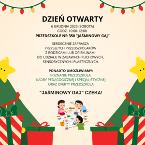 Zapraszamy na dzień otwarty 06.12.2025 r. (sobota) w Przedszkolu nr 350 „Jaśminowy Gaj”, przy ul. Wieluńskiej 12 w Warszawie.